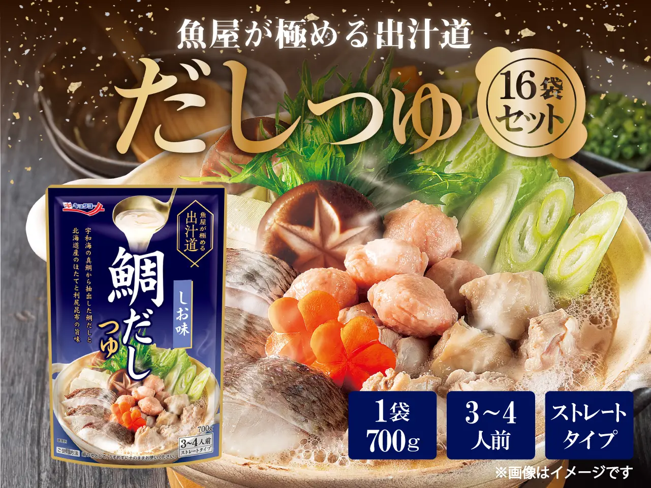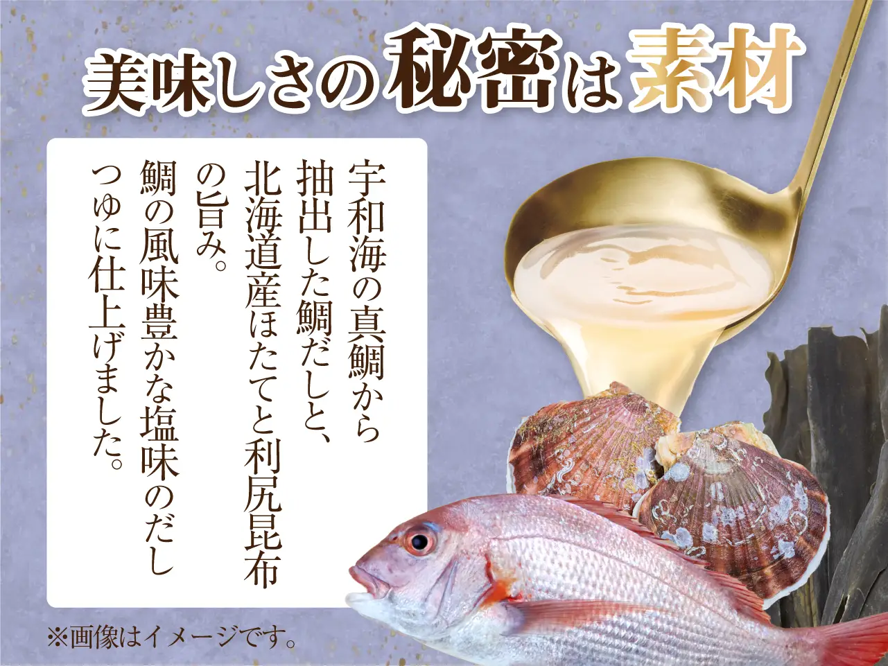 宇和海(うわかい*)の真鯛から抽出した鯛だしに、北海道産のほたてと利尻昆布の旨みを合わせた、澄んだ味わいのあっさりしお味。