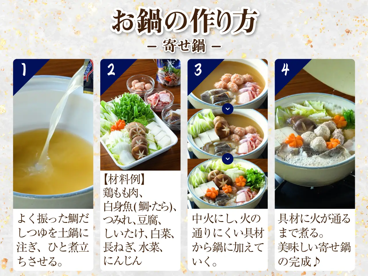 冬はあつあつの「鍋つゆ」に、夏は冷やして「つけつゆ」にと、季節を問わずお楽しみいただけます。